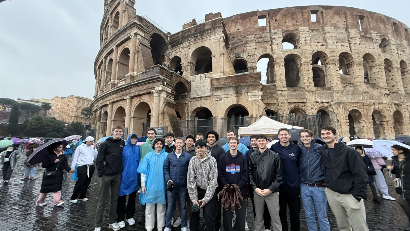 Members of Dominican University's men’s volleyball team took their skills to Europe over winter break, competing in four matches in three different countries.