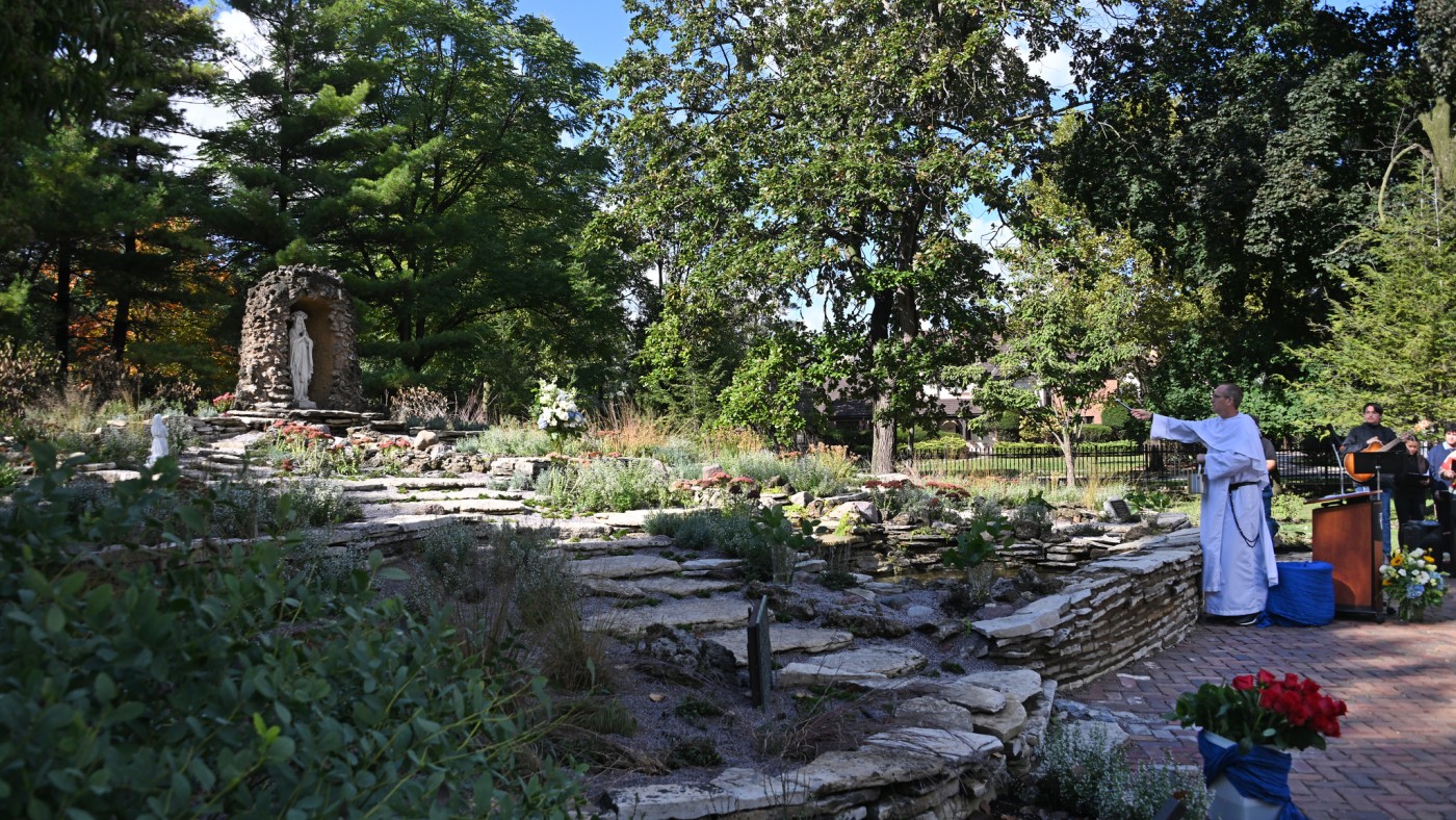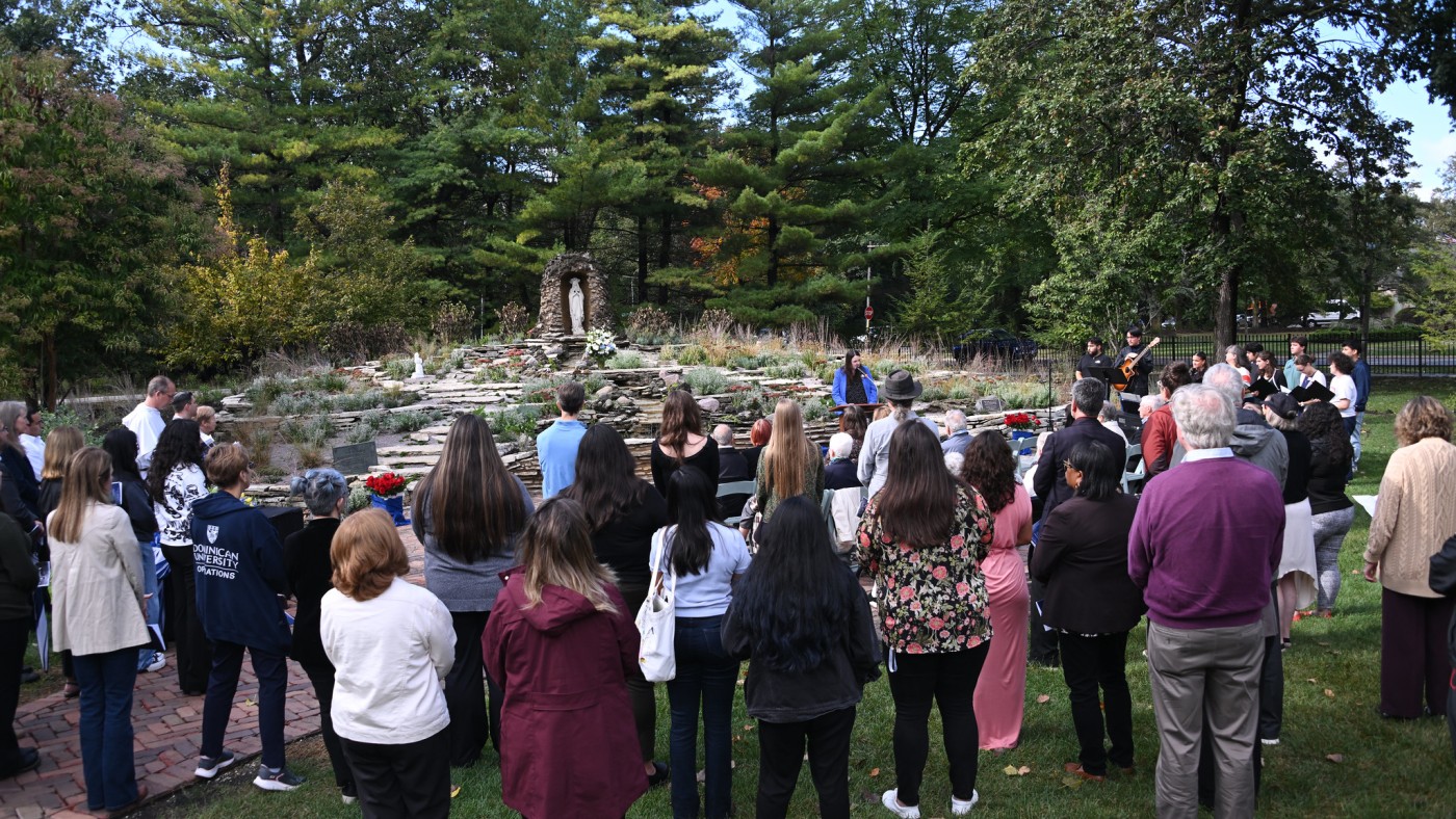 The ceremony, which included a blessing of the grotto by Fr. Brendan Curran, O.P., Dominican University trustee, was attended by members of the DeLetto family, whose foundation supported the recent renovations of the grotto. A plaque noting the DeLetto Family Foundation’s contribution has been added to the Grotto space.